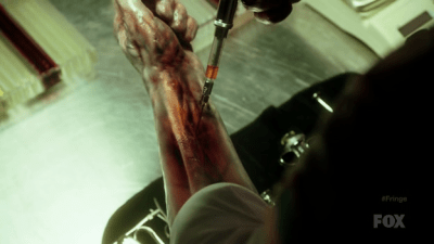 - Awesome translucent shots of the shape shifter injecting himself with the ever present Fringe Big Needle